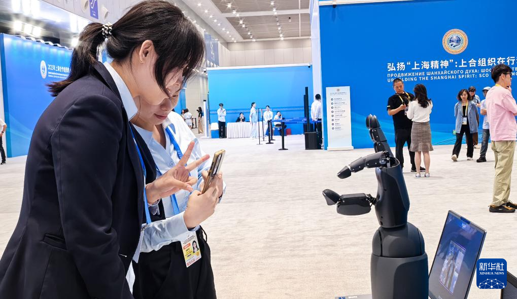 8月30日,两名女士在2025年上海合作组织峰会新闻中心与机器人灵巧手互动。该机器人灵巧手具有超高自由度和多维触觉精细力控。
